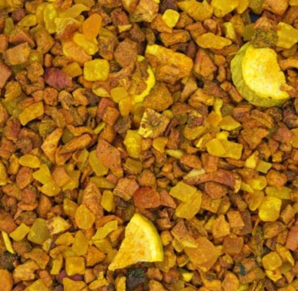 Trozos de manzana, trozos de pera, dados de dátil, trozos de naranja, jengibre confitado, gránulos de mandarina y naranja y aromas.